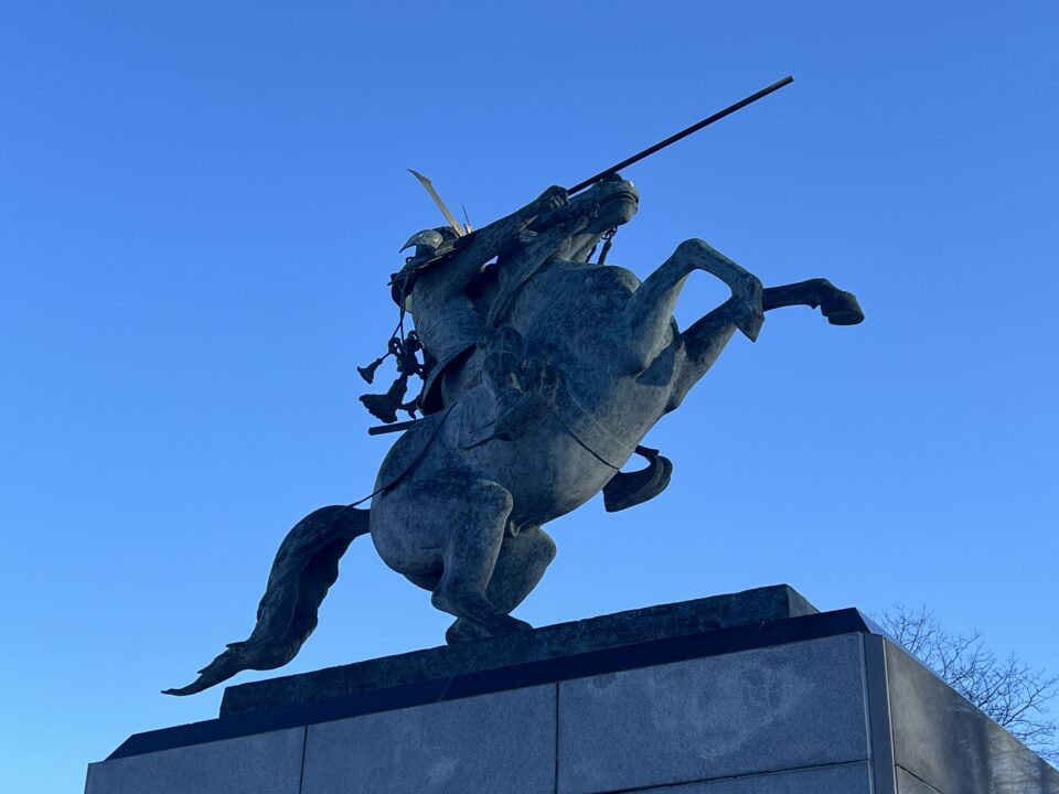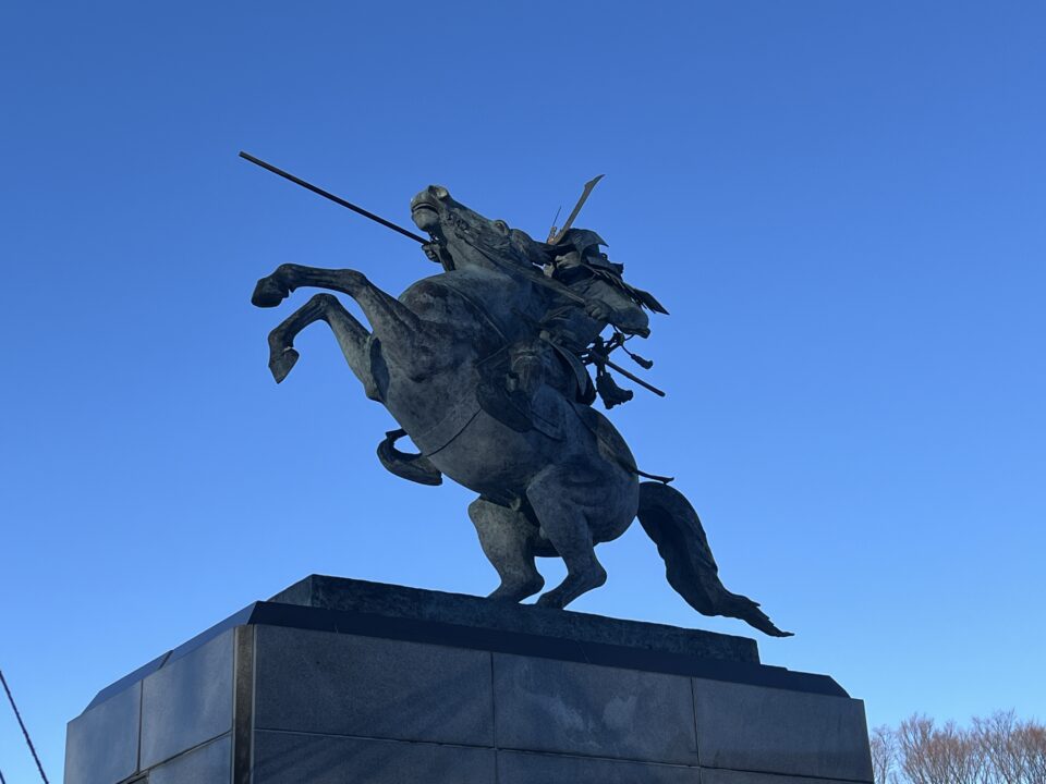 山形の戦国武将の銅像が山形市霞城公園内にあります。山形市民でさえ、こんな素晴らしい銅像があるのを知らない方も多いのではないでしょうか。午年ということで改めて見に行って来ました。1977年11月に設置されたもので、重さは3トン。これだけの重さのものを2本足で支えているのはまれだそうです。山形鋳物900年の歴史から生み出された技術は素晴らしいですね。