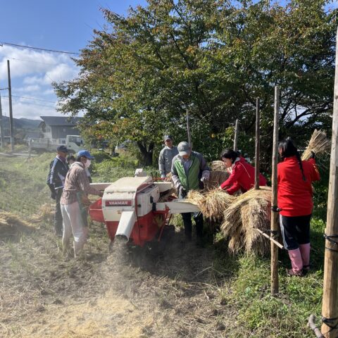 稲扱き 協調性今日は、譲り川酒米研究会と芸工大でコラボしている米の稲扱き(いねこき)をしました。集合の号令が掛かったものの、「稲扱きってどんな作業???」刈り取った稲の穂から籾(もみ)をこき落とす作業です。皆さんはその後のその後、米粒 ・・・